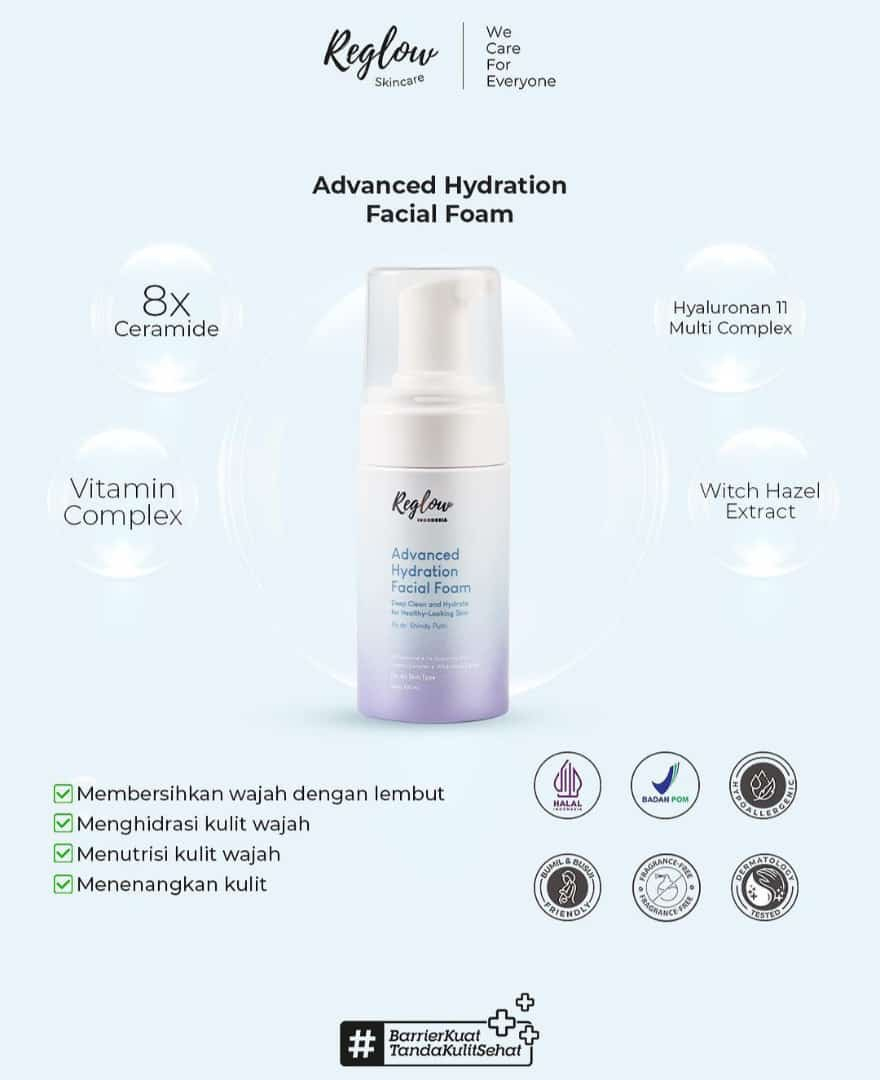Manfaat Produk: • Membersihkan kulit dengan lembab, tanpa membuat kulit kering dan ketarik • Melembabkan dan menghidrasi kulit • Menutrisi Kulit • Menenangkan kulit • Aman Untuk Kulit Sensitif Cara Penggunaan: 1. Basahi wajah terlebih dahulu, lalu tuangkan Reglow Advanced Hydration Facial Foam secukupnya pada telapak tangan. 2. Usap di wajah secara perlahan dengan gerakanmemutar. Lalu bilas dengan air bersih. 3. Untuk hasil yang lebih maksimal gunakan dua kali dalam sehari pada pagi dan malam hari bersamaan dengan rangkaian Reglow Skin Barrier Series lainnya.