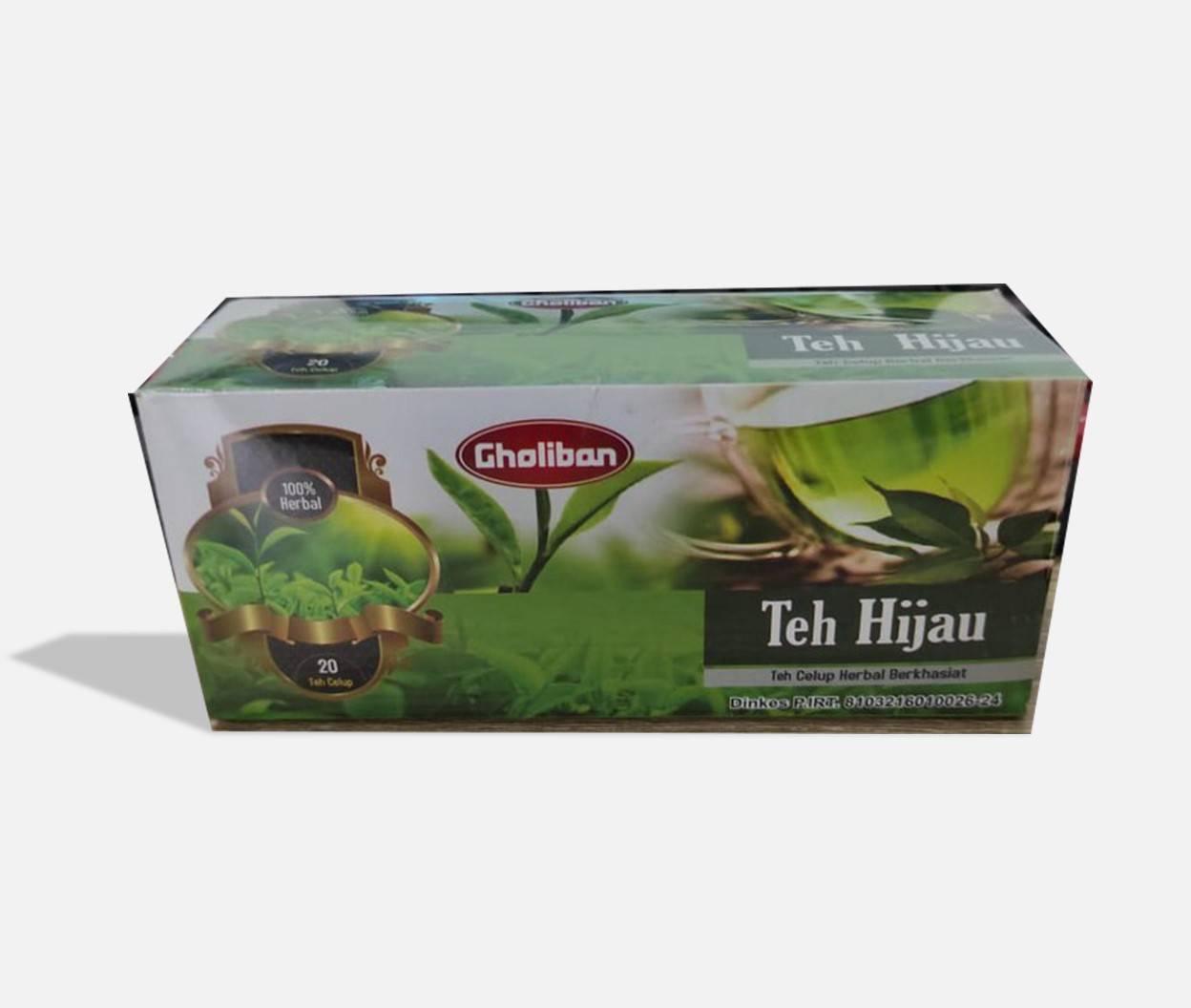 Dinkes P.IRT No. 8103216010026-24Masa Expired 2 TahunDiproduksi : BP JAYA BekasiDidistribusikan : GholibanKemasan : Isi 20 teh celupTeh Hijau Celup Gholiban merupakan minuman teh herbal berkhasiat yang sudah lama dikenal sebagai pengganti minuman seperti kopi dan lain-lain yang lebih sehat karena rendah kandungan kafein dan mengandung antioksidan alami yang sangat kuat yang disebut polifenol. Teh hijau juga merupakan pilihan yang sehat karena cara pembuatan diproses secara hiegenis sehingga sangat aman untuk dikonsumsi dalam jangka panjang. Komposisi Teh Hijau Gholiban : Ekstrak Daun Teh Hijau 100% Manfaat dan Kegunaan Teh Hijau Gholiban : 1. Membantu mengobati berbagai penyakit kanker atau tumor 2. Membantu menurunkan kadar kolesterol 3. Membantu menurunkan Gula darah / diabetes 4. Membantu Menurunkan Darah tinggi / hipertensi 5. Membantu menghancurkan Batu ginjal 6. Membantu mengontrol Berat Badan 7. Membantu menyegarkan nafas 8. Kulit menjadi lebih sehat 9. Membantu mengurangi reaksi alergi Aturan Minum Teh Hijau Celup :– Masukkan 1-2 kantong teh celup kedalam cangkir – Seduh dengan air panas – Biarkan hingga air berwarna kehijauan dan tambahkan pemanis sesuai selera