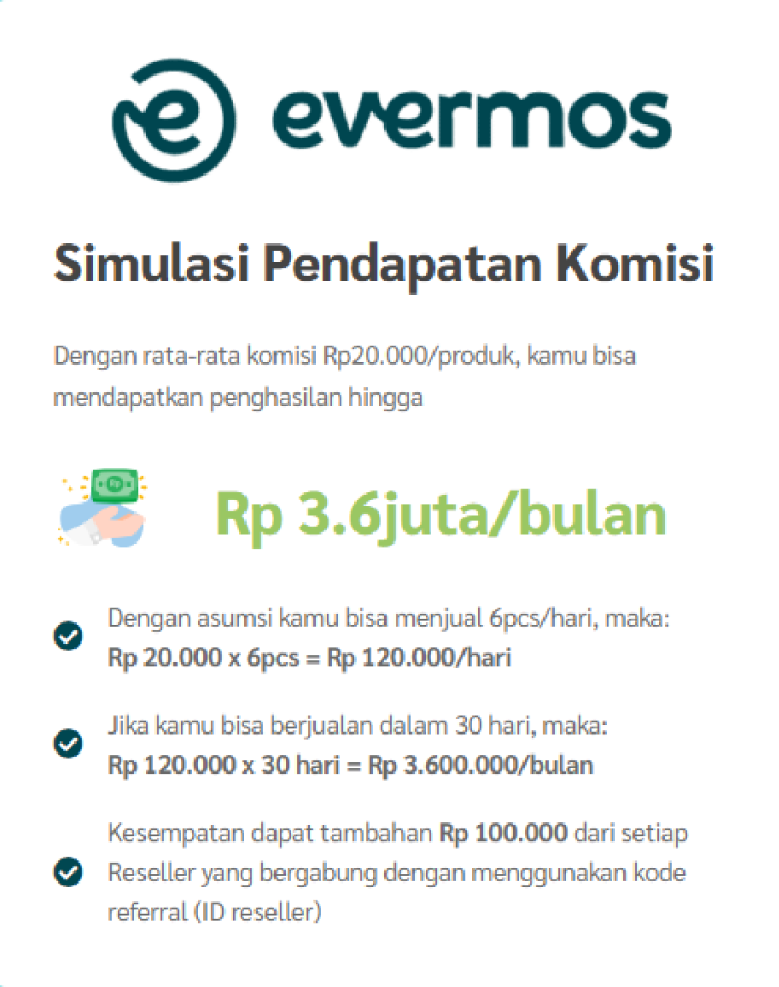 Di Evermos, kita menargetkan sampai dengan 35% komisi dari harga produk, dan tidak ada limit pesanan, banyak pesanan = banyak komisi!